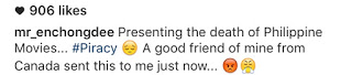 Enchong captioned the screenshot image with 'Presenting the death of Philippine Movies' using hashtag #Piracy. He also explains that a good friend of him from Canada sent the information to him